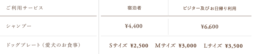 ※宿泊のみ、同室利用に限り2頭目は半額(同室利用は2頭まで)